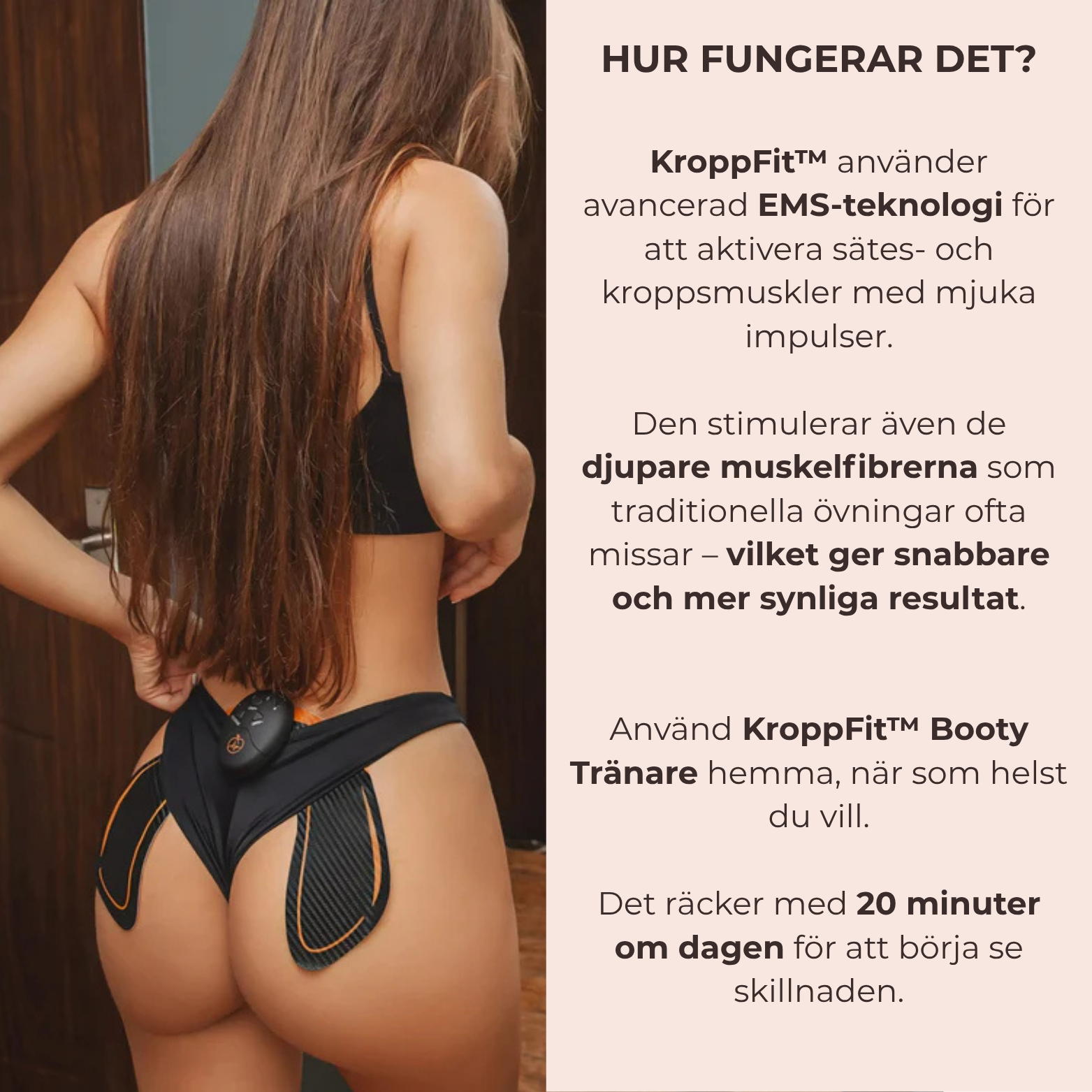 KroppFit™ Booty Tränare använder avancerad EMS-teknologi (elektrisk muskelstimulering) för att skicka små, säkra impulser till dina sätesmuskler – precis som du ser i videon.